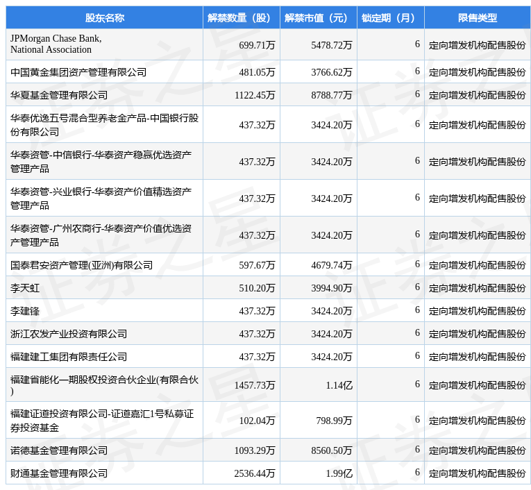 根据市场公开信息整理,厦门港务(000905)于2月16日将有1.17亿股限售股份解禁上市,为公司定向增发机构配售股份,占公司总股本15.72%。最近一年内,该股累计解禁9419.15万股,占总股本的12.7%。本次解禁后,公司还有1500.0股限售股份,占总股本0.0%。具体如下图所示: