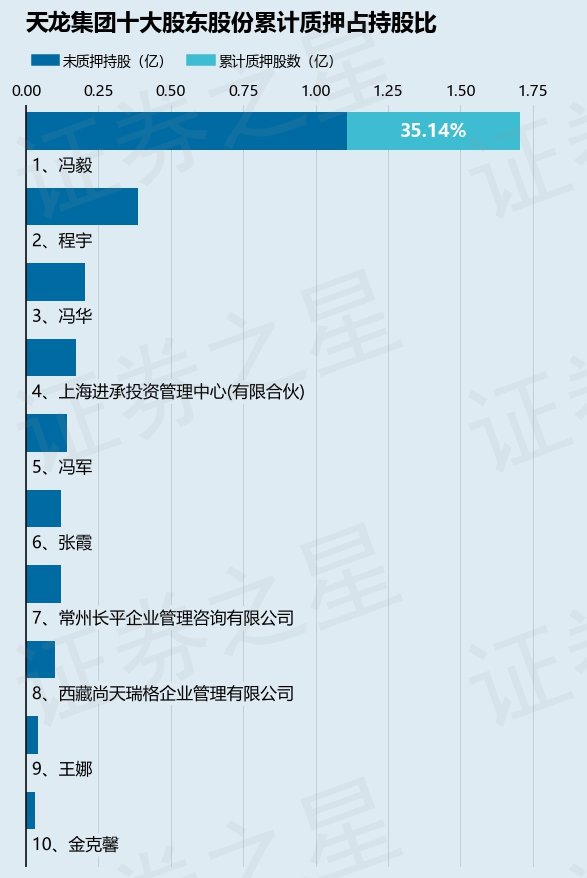 截止本公告日,股东冯毅已累计质押股份6000.0万股,占其持股总数的35.14%。本次质押后天龙集团(300063)十大股东的累计质押股份占持股比例见下图: