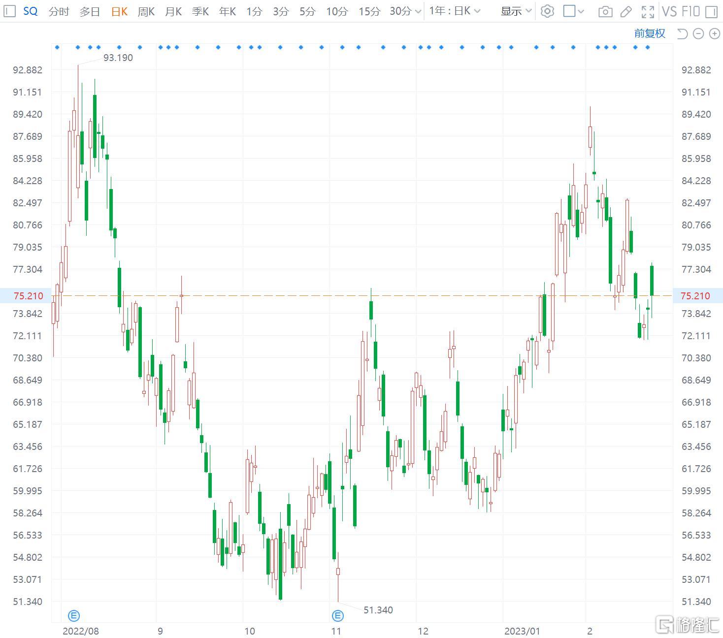 格隆汇2月24日丨Block涨1.48%,报75,25美元,总市值453亿美元,盘中一度涨近5%。Block第四季度营收增长14%至46.5亿美元,超预期的45.7亿美元;调整后EBITDA为2.81亿美元,远超预期的2.188亿美元;调整后每股盈余22美分,低于预期的30美分;总支付额531.6亿美元,低于预期的552.2亿美元。公司预计2023年调整后EBITDA为13亿美元,超预期的12.8亿美元。